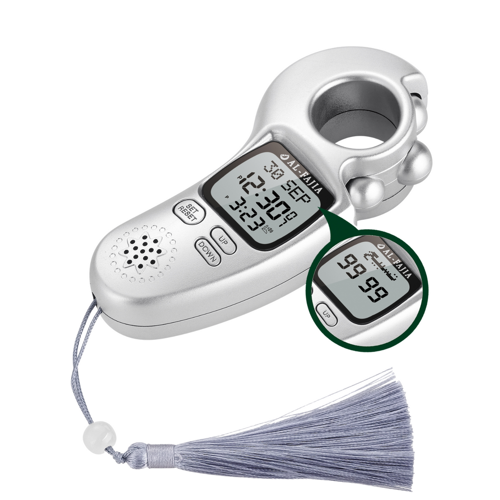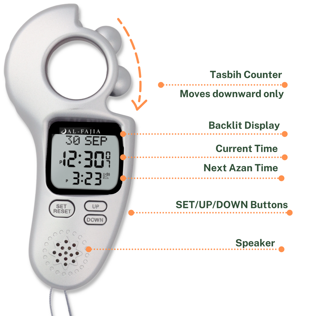 AL-FAJIA Digital Portable Tasbih Counter Azan Clock Reminder Islamic Auto Prayer Time (Silver)