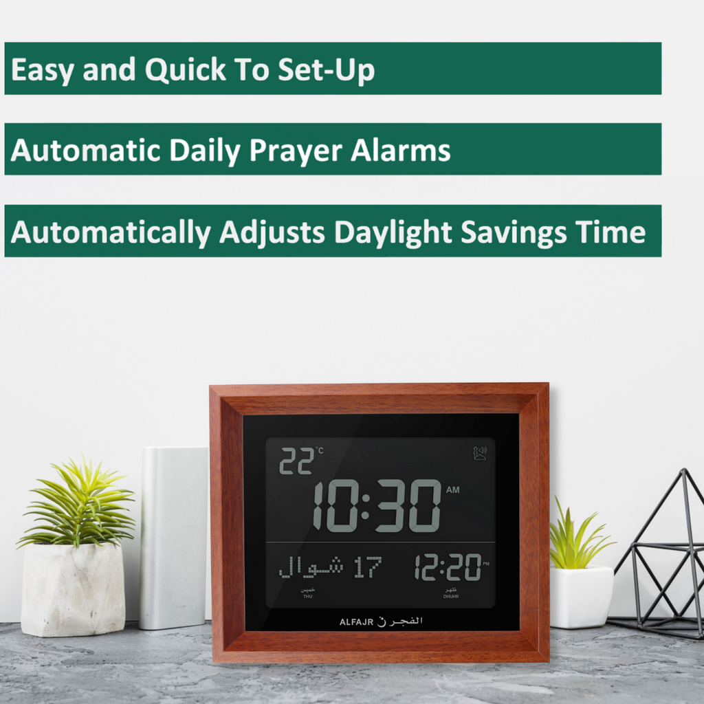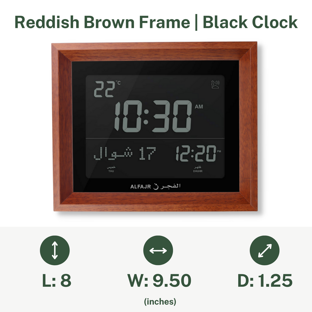 Alfajr CF-19 Azan Clock (Black) with Detachable Solid Wood Frame (Reddish Brown)