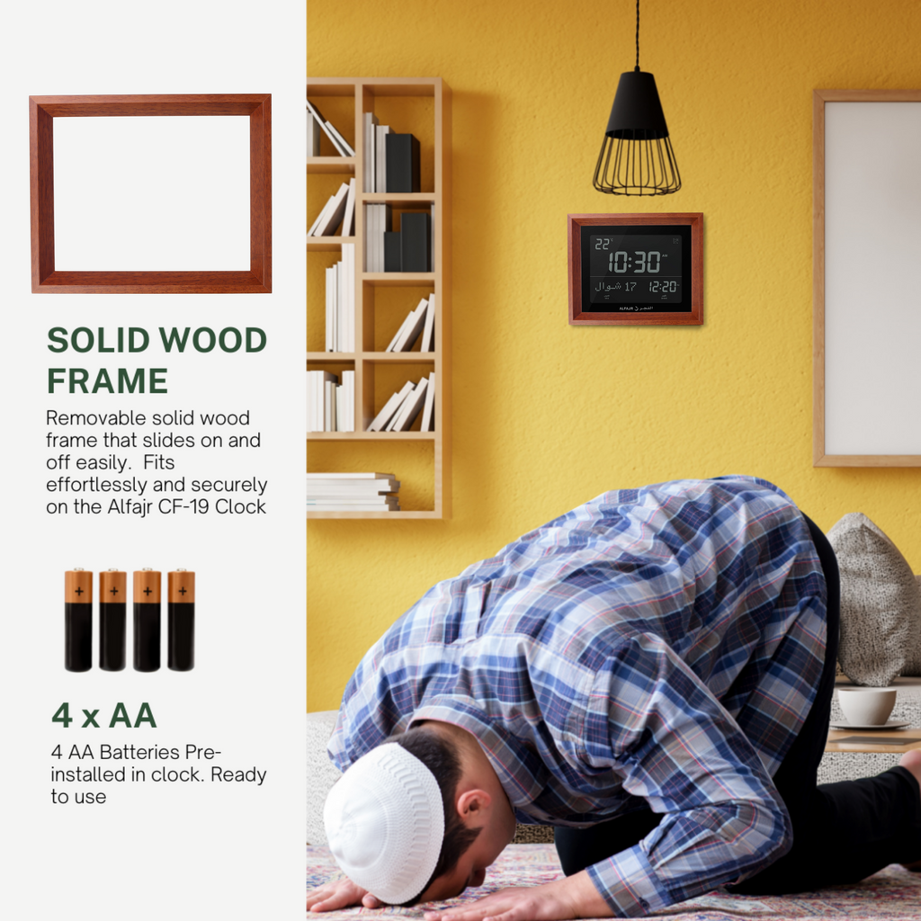 • Package Includes: 1 x CF-19 Azan Clock, 1 x Removable Frame, 4 x AA Batteries (Pre-Inserted)