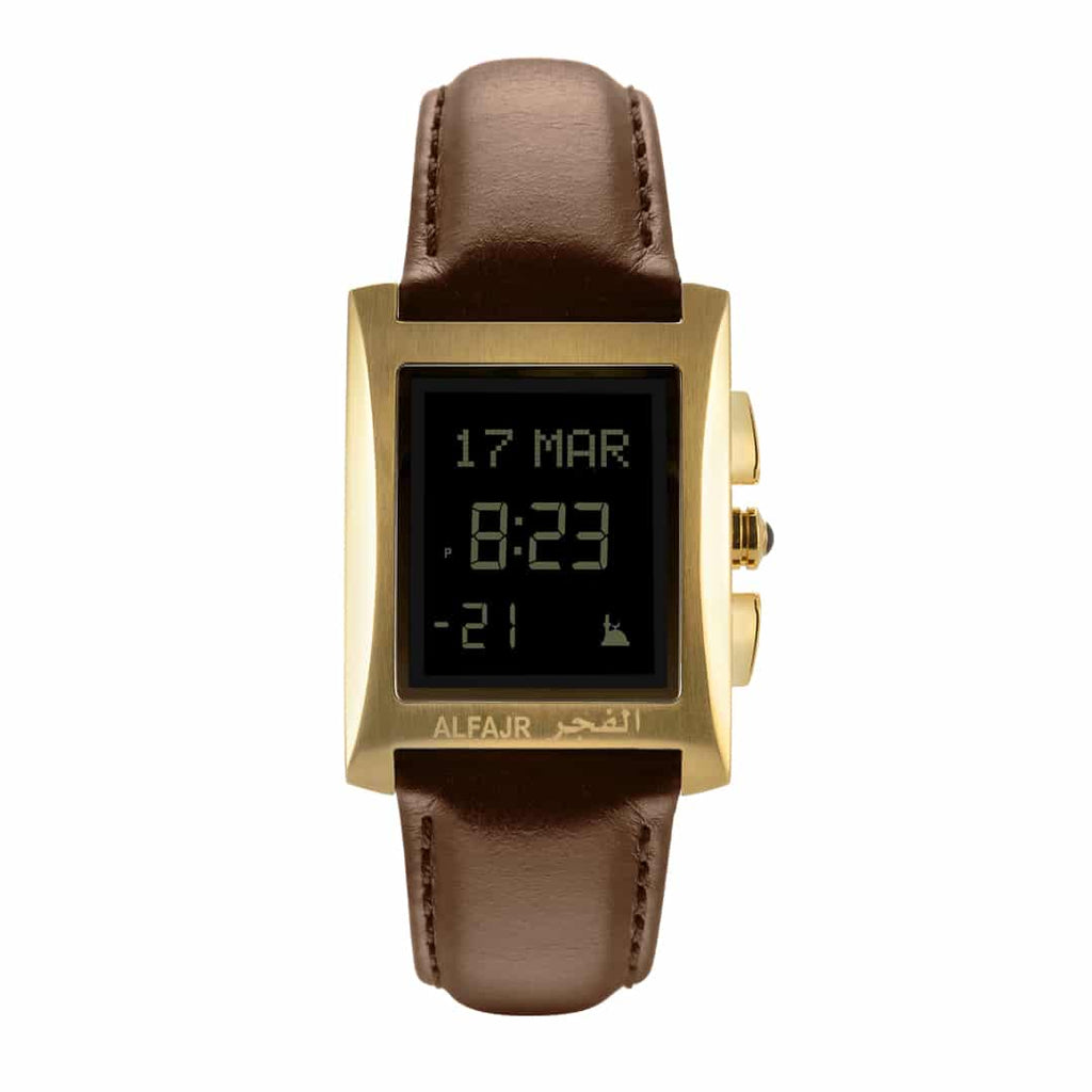 Alfajr WL-08L Gold Plated Rim Black Dial Brown Leather Strap Classic Stainless Steel Azan Prayer Watch
