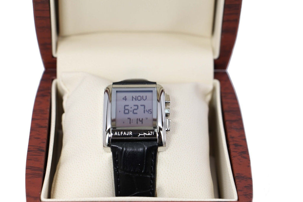 Elegance watch displays dual time (analogue – digital). with round case and aluminum band. hidden FSTN black LCD, it display date and prayer times. Features: Worldwide Prayer Times Digital Compass for Qibla Direction Daily Alarm and Prayer Alarms Arabic/English Language...