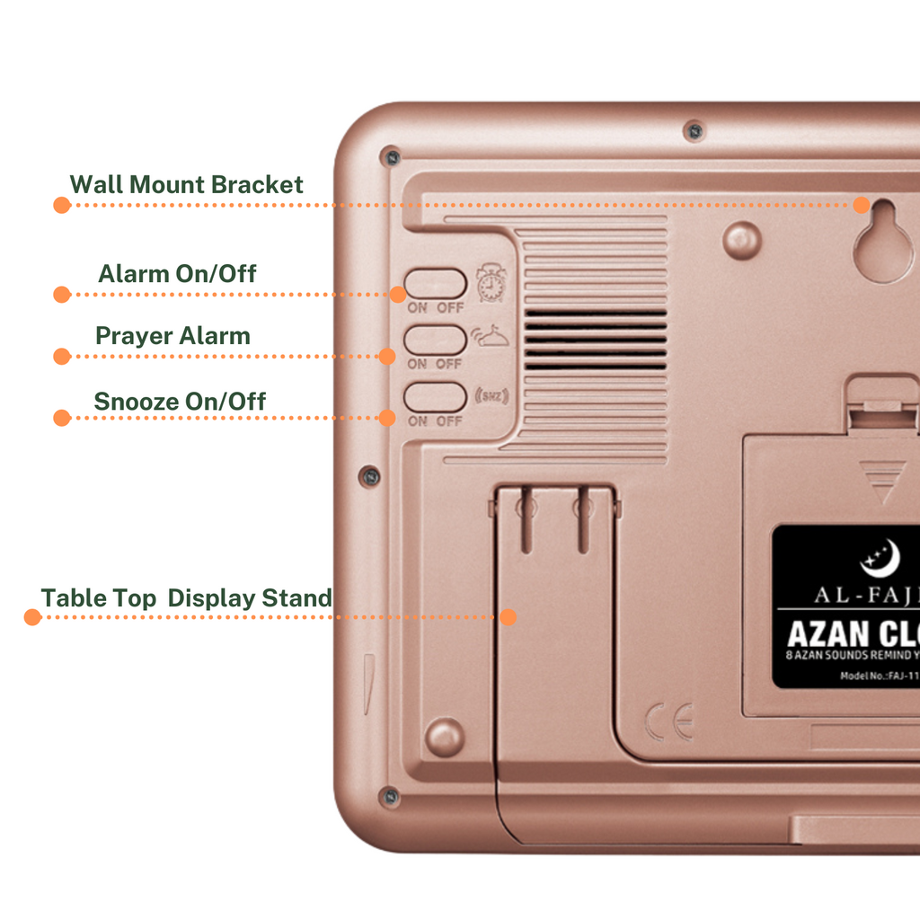 AL-FAJIA Azan Clock FAJ-113 is a beautiful and functional Islamic table clock, that calls for prayer with a complete azan five times a day. The smallest of the AL-FAJIA azan clocks, the FAJ-113 is the most compact azan clock you can find. Easy to carry and ideal for small spaces or offices. It has all the features of an ALFAJR Azan Clock. This portable Azan Clock is ideal for small rooms, spaces, and offices. This clock is a perfect for home or work to remind you with a call to prayer.