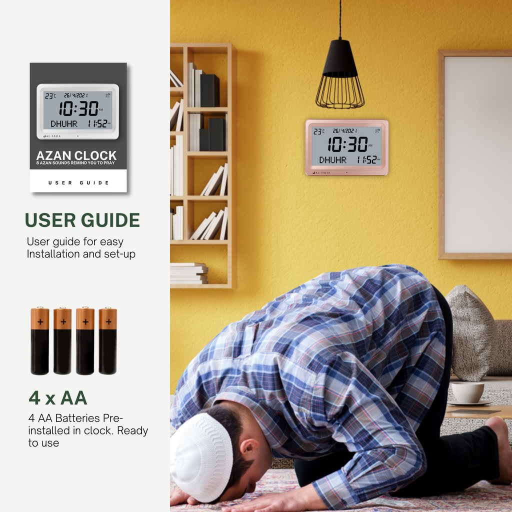 • The perfect Azan wall clock for an office, classroom, bedroom, and any room in your home. Easy to Hang. Comes with 4 "AA" alkaline battery.