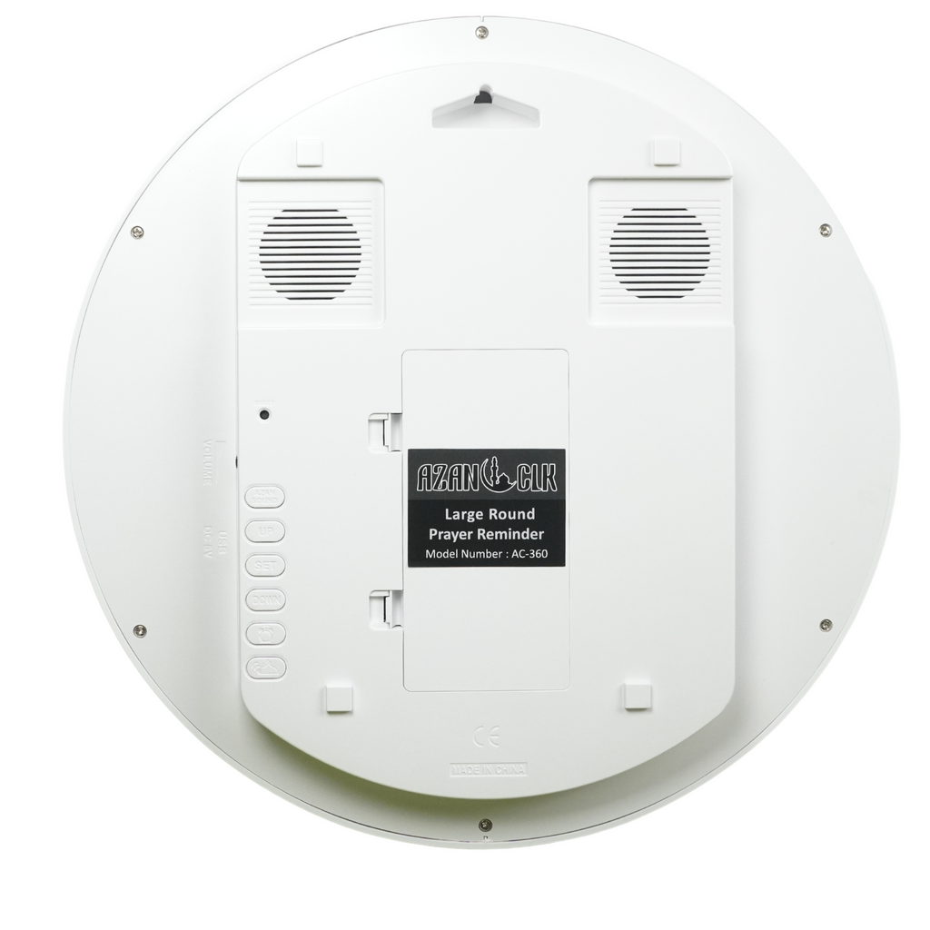AzanClk Large Round Azan Prayer Clock is a beautiful and functional Islamic clock with white Digital Display and white frame, that calls for prayer with a complete azan. A high quality digital Azan sound for all prayers (including complete Fajr azan) can be played. Azan times are calculated accurately for all cities around the world and Azan volume control fitted in all clock models.