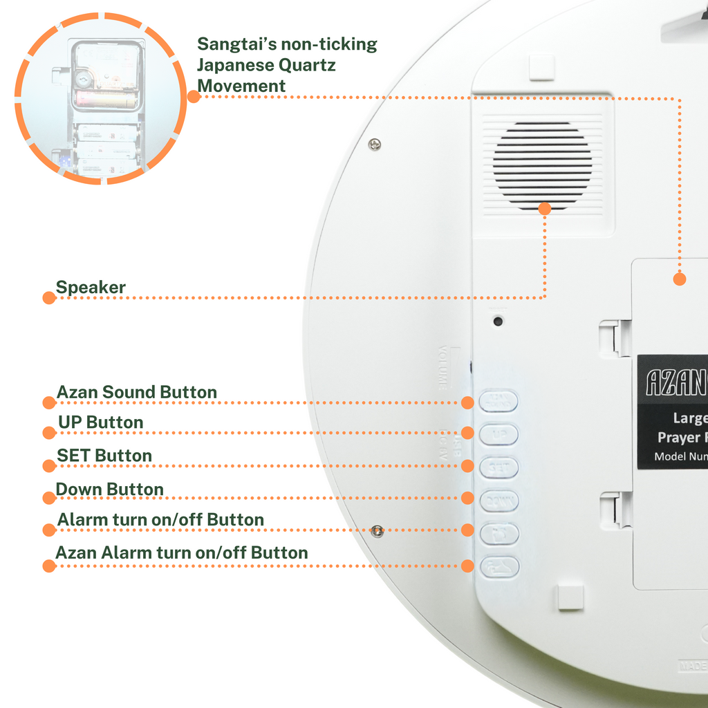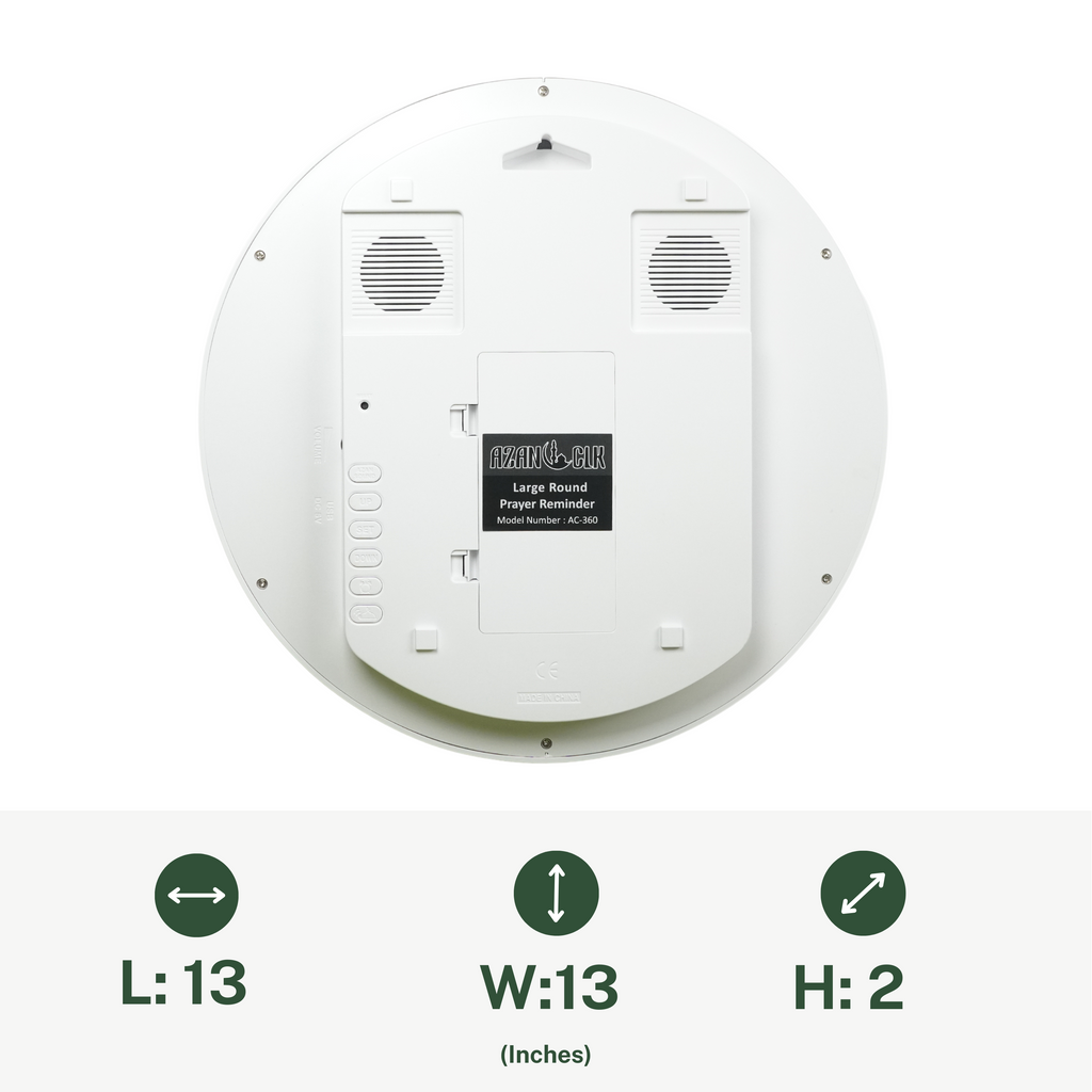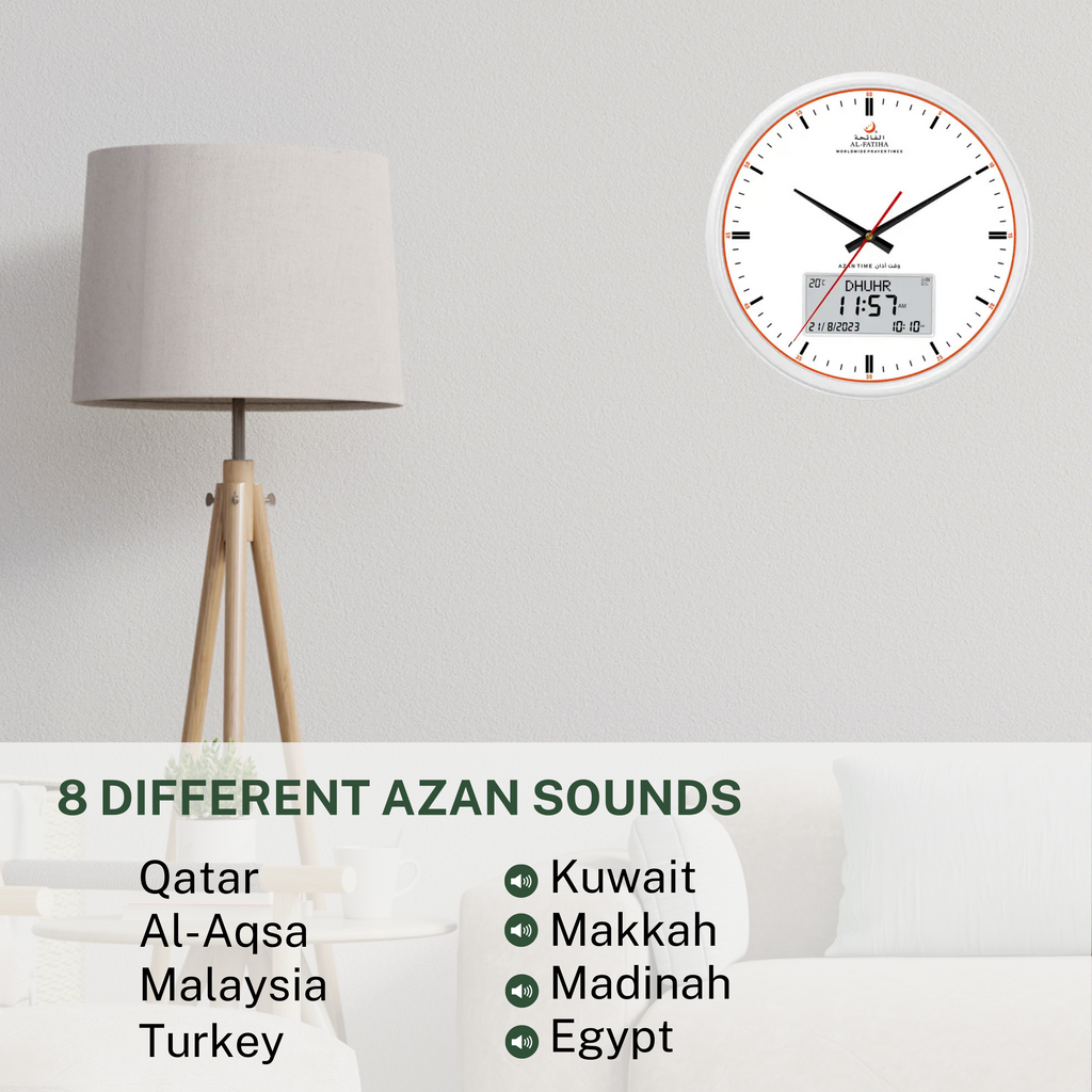 • Diverse Azan Sounds: Experience a rich selection of 8 high-quality Azan sounds, including Makkah, Madinah, Kuwait, Egypt, Qatar, Al-Aqsa, Malaysia, and Turkey, with the large size AzanCLK 13inch/ 33 cm ,White Frame and White Digital Display , AC360WW for a personalized and immersive prayer experience.