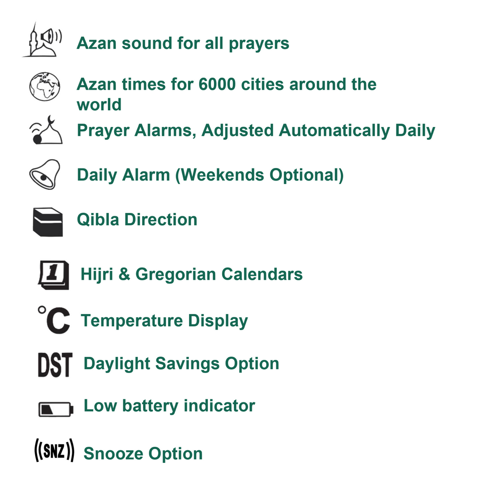 • COMPLETE AZAN (for all cities around the world): A high-quality digital Azan sound for all prayers can be played. With azan volume control fitted in all clock models. Azan times are calculated accurately for all cities around the world.