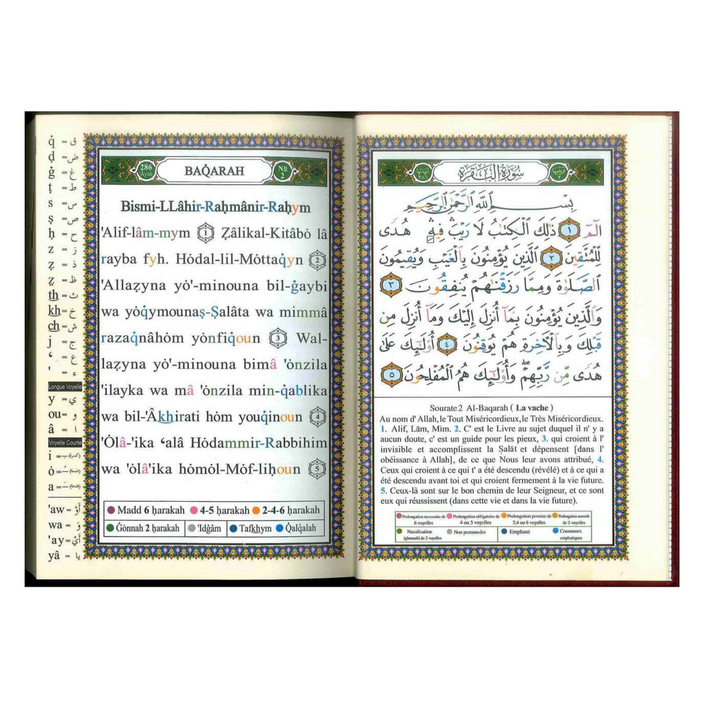 This complete Colour Coded Tajweed Quran comes with a nice and beautiful hard cover, it includes translations and transliteration into French.